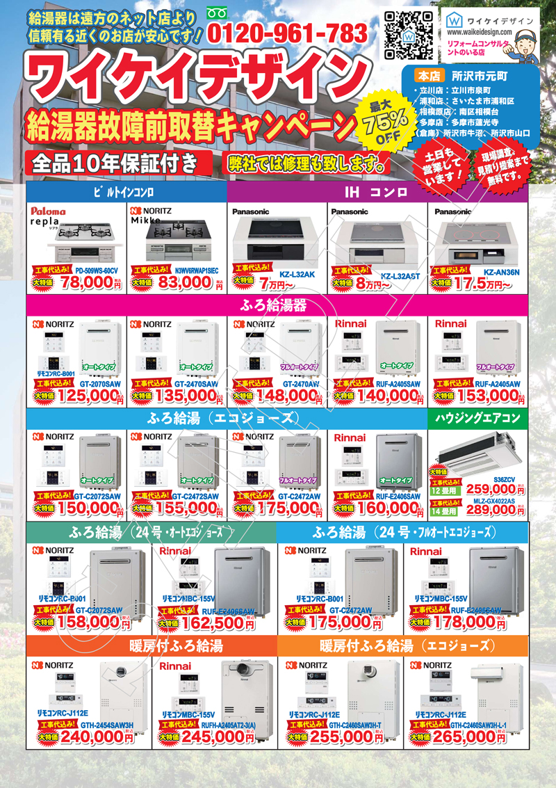 リクルートコスモスのマンションに住んでいます。給湯器のエラーが出ていてワイケイデザインさんに点検に来ていただきました。15分程点検していただき、不具合箇所の説明を聞き、修理するのであれば2万円程かかるとの事でした。給湯器は18年経過しているので買替えをすすめられて、キャンペーンチラシと一緒にお見積書をいただきました。